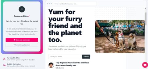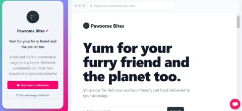 To understand how powerful artificial intelligence is in the website building arena, we had a go ourselves at creating our own website – Pawesome Bites. Our fictional store is an ecommerce website that sells sustainably sourced pet snacks. To help our furry friends find their next favourite food, we used an AI website builder, AI tools, and AI add-ons to see what we could come up with. Here are your options: